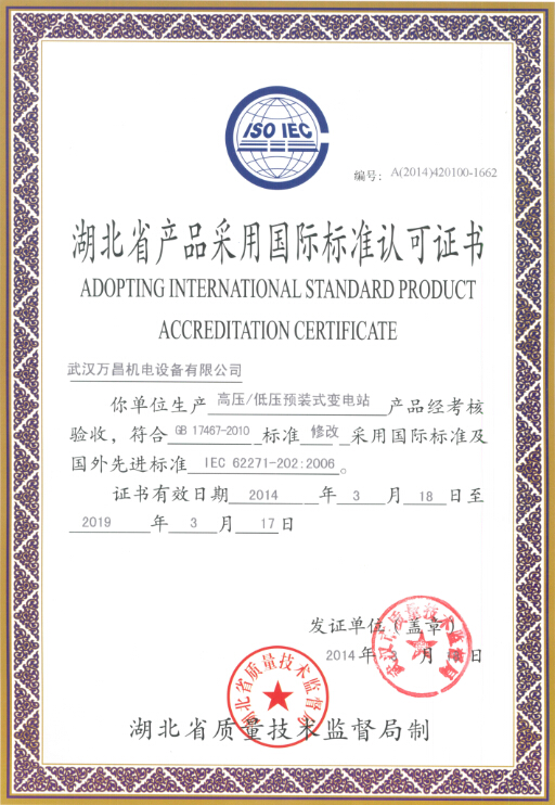 湖北省產(chǎn)品采用國(guó)際標(biāo)準(zhǔn)認(rèn)可證書(shū)(箱變)